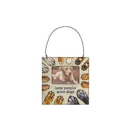 A hanging wooden mini frame featuring painted dog paws and "Less People More Dogs" sentiment. Design is replicated from original artwork painted onto burlap canvas, giving the art a unique depth and texture. Fits 3" x 2" photo. Includes a twisted wire hanger, magnet, and peg for standing.